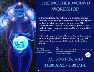 The second offering is “The Mother Wound”, to be held on Saturday, August 25 from 11:00 AM – 2:00 PM.  This will be a step on the healing journey for anyone who has been affected by the physical and/or emotional trauma inflicted by their maternal figures.  We will connect, talk, cry, bond, journal and meditate our way toward healing.  Please dress comfortably, bring a yoga mat or blanket to sit on, a pillow may be helpful, and a journal/pen.