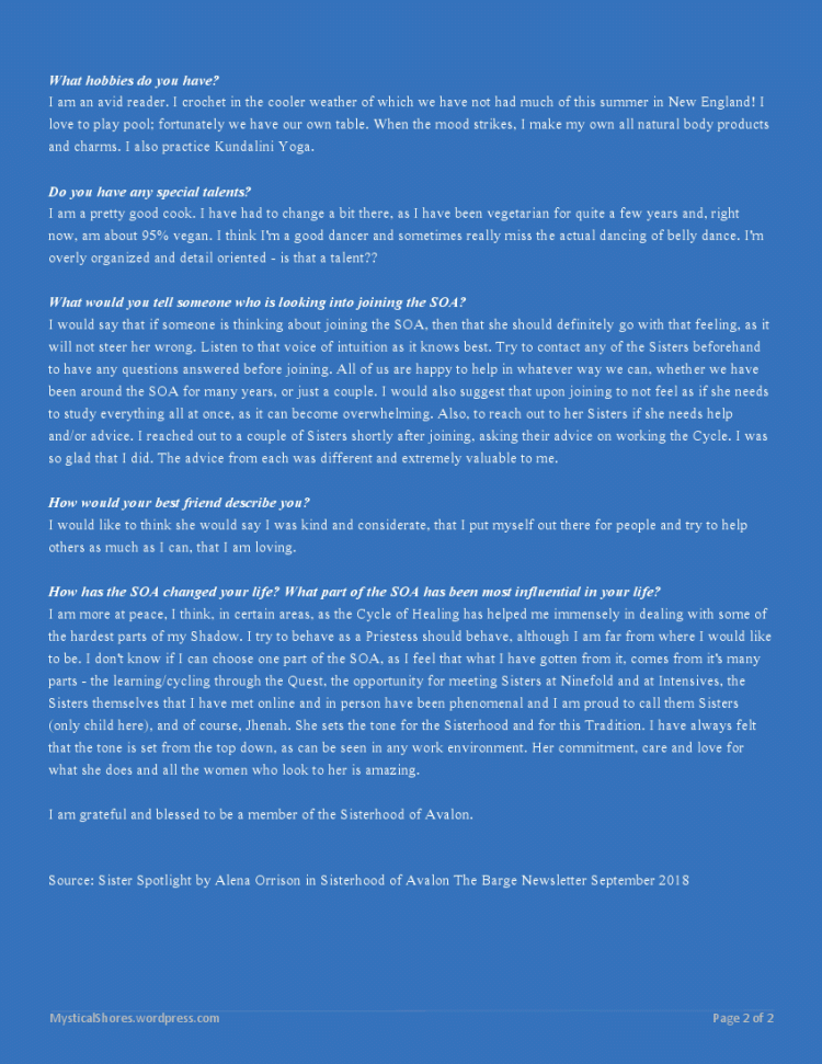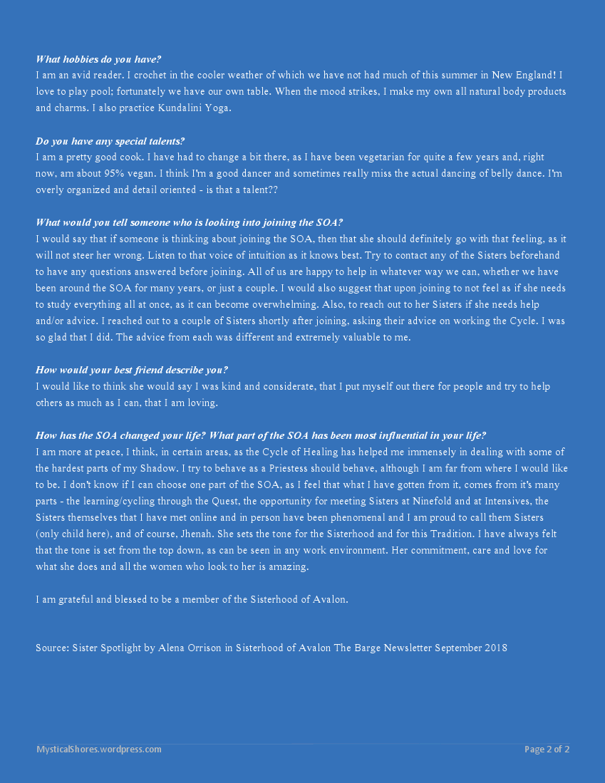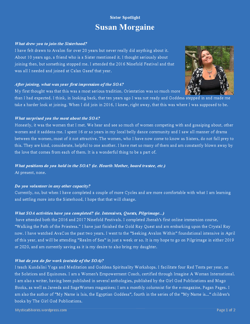 Interviews A Recent Interview: Sister Spotlight in The Barge Older Interviews Dancing for Life with Sumora (from 2014) A DAUGHTER OF THE GODDESS by Susan Morgaine (from 2014) Share this: Click to share on X (Opens in new window) X Click to share on Facebook (Opens in new window) Facebook Click to share on LinkedIn (Opens in new window) LinkedIn Click to share on Pinterest (Opens in new window) Pinterest Click to share on Threads (Opens in new window) Threads Click to share on WhatsApp (Opens in new window) WhatsApp Click to share on Mastodon (Opens in new window) Mastodon Click to print (Opens in new window) Print Click to email a link to a friend (Opens in new window) Email Click to share on Bluesky (Opens in new window) Bluesky Like Loading...