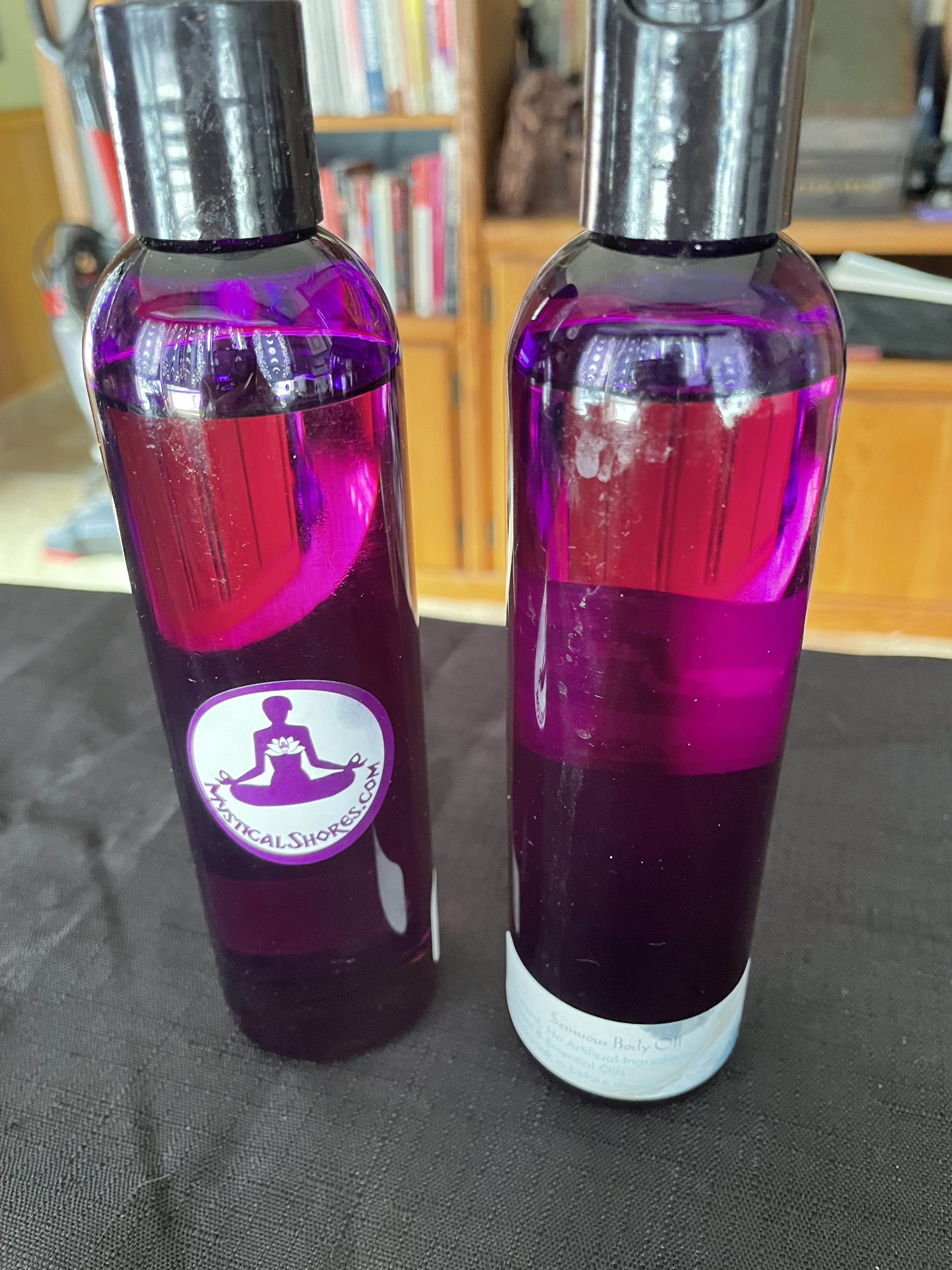 Emollient & essential oils, light scent of ylang ylang. To be used after bath or shower; can also be used as a massage oil. Contact me if you would like a specific scent. $20/bottle